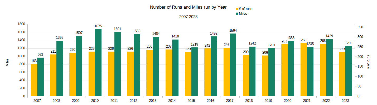 Here’s a pretty graph breaking it all down by year. Yellow is the number of runs and is using the scale on the right. Green is miles and uses the scale on the left. Yeah, I know it’s backwards. I’m too lazy to fix it. Well actually, when I tried to fix it, everything switched and it was backwards the other way. Aghh!