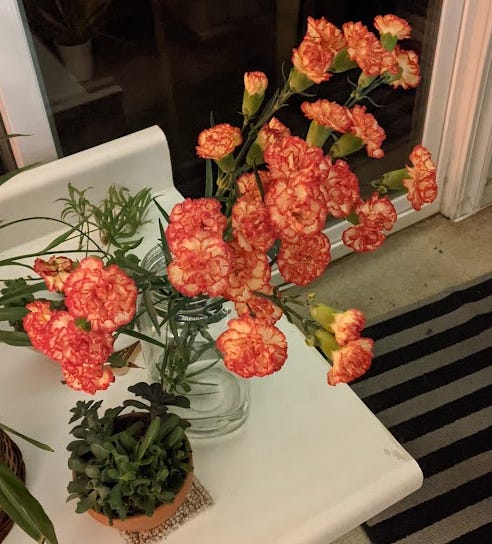 I get to the parking lot and I’m a bit early. Sigh. So I play Yahtzee on my phone. Twice. Then I grab my carnations and head on in.