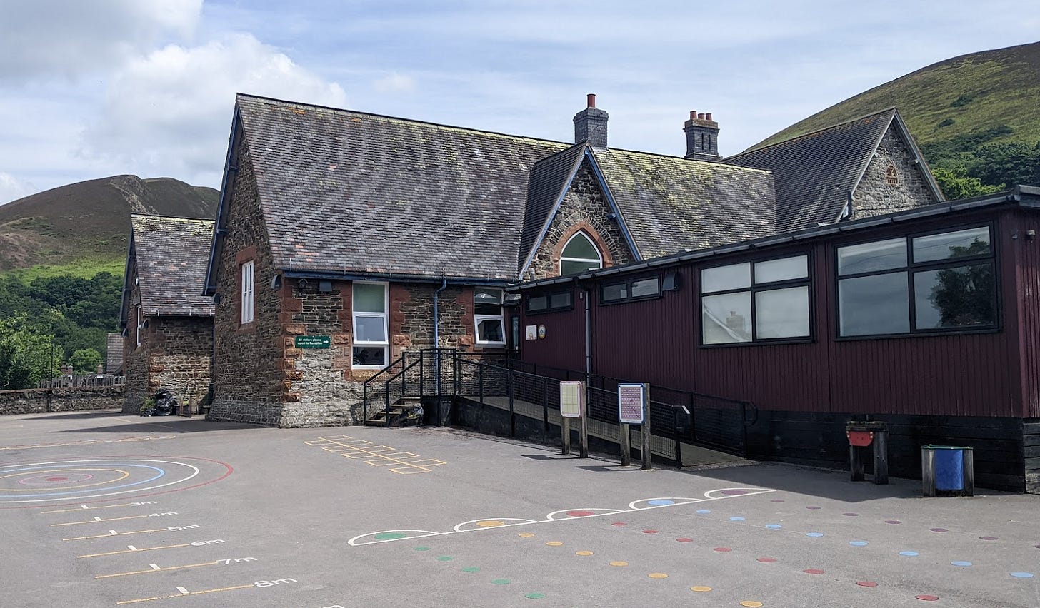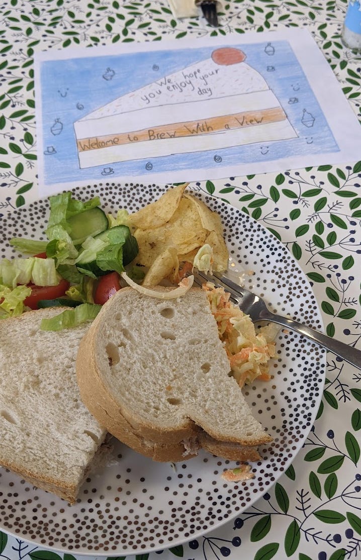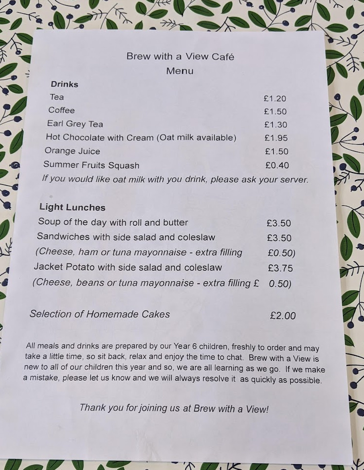M found a thing on Facebook. A school in Stiperstones (Stiperstones CE) was serving light lunch and tea for the community. Put together by the year 6 students, they handle the whole thing. They take the orders. They make the food. They serve it. They handle the money. Lovely. The place was maybe a quarter full when we went in. Four tables down one side with a few people and one long table on the other that was eventually packed ~ surely all relatives. There was a sign encouraging us to be patient. No problem.