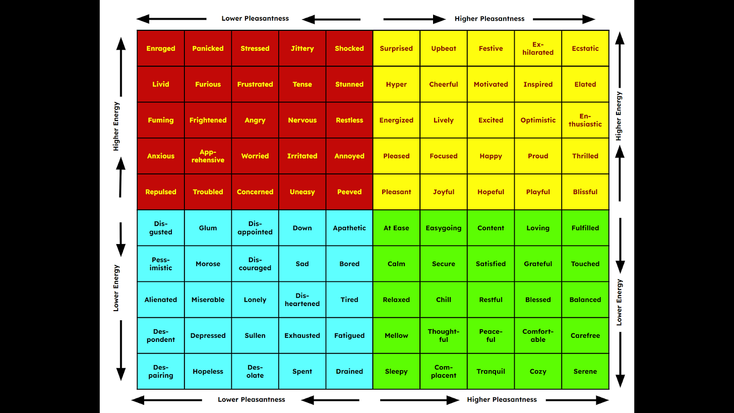 This handy dandy thing can help you find words for the emotions you’re feeling. I’ve been showing it the students this week and they all seem to be getting it pretty quickly and buying in. Basically you’re measuring two things. Vertically you place yourself on the chart based on your energy level. The more energetic you’re feeling, the higher you are on the chart. Pooped out? You’re at the bottom. Horizontally you place yourself based on your level of pleasantness. Then you just plop your finger down on a word and presto, there’s a pretty good chance that word will describe your current mood pretty accurately. I frequently want to move one word up or over but it’s usually pretty good.
