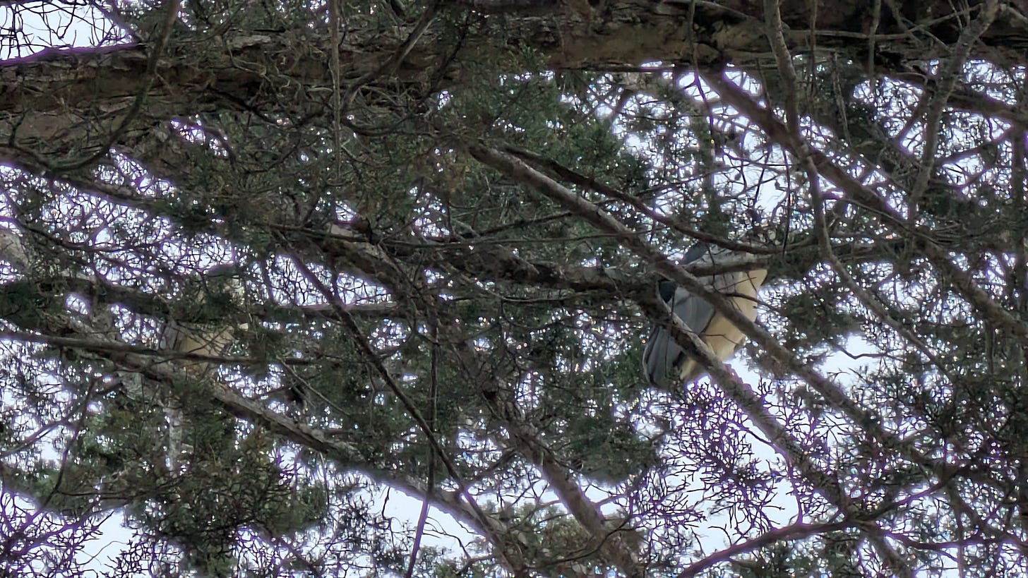 After school I put on my running clothes to run home. Yeah, “run” sounds like a task, but I am free. I don’t actually have to run all the way home. I can stop at the night heron trees and see what there is to see. And so I do. I saw 6 total in the two trees. How many can you see? (yeah, it was getting dark… I’m sorry!)