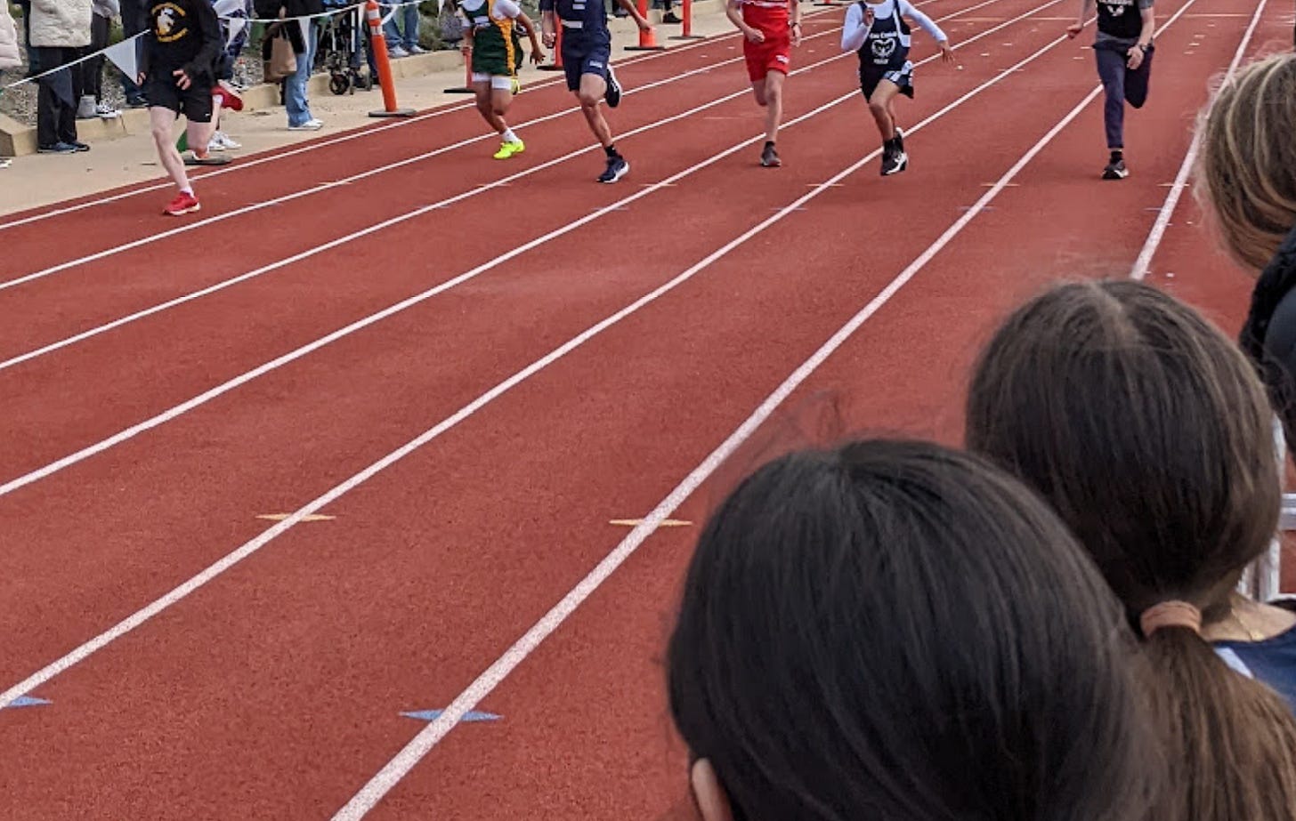 After a few minutes I left her with her mom and tracked down a couple of other 7th grade girls and sent them over to be supportive and give hugs. Hugs were given. I think the embarrassment was mostly averted. They convinced her to run the 100 with them and she did even though she didn’t want to. Small victories but then she came in last in her heat. ugh.