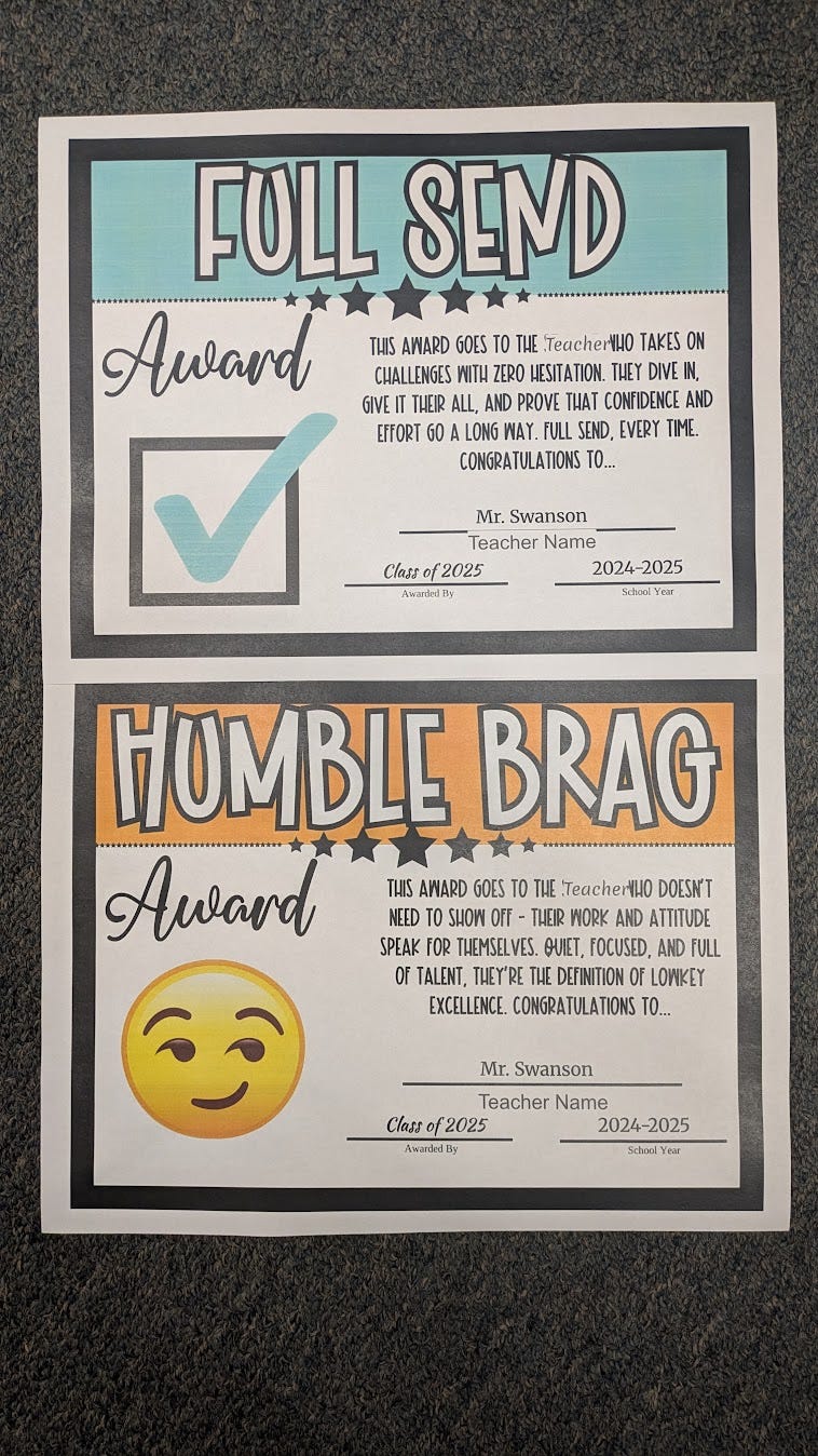 I got three awards this year, which is pretty unusual. For the first time I remember the 8th grade class gave awards to the teachers. I got two. I have to say… I think they did pretty well in nailing it. I guess they did have me for (well, some of them) nine years. They should know me. Here they are - FULL SEND and HUMBLE BRAG.