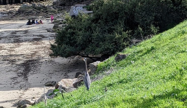 Fairly unperturbed by all the people exercising. Yes – A Great Blue Heron. I wonder if they name themselves. “yes, I’m great. I’m blue. Admire me”.