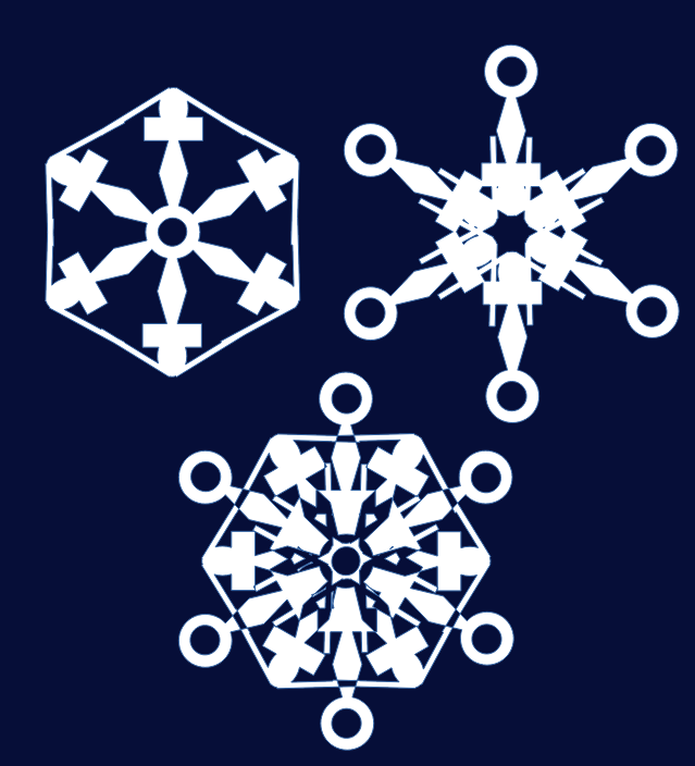 The snowflakes below were created as my example to the students today in class. The initial shape is extremely simple, really. (In the top left snowflake just pick out the circle, the diamond, the rectangle, the oval and a piece of the line around the edge… The circle is the common element of all 6 pieces)