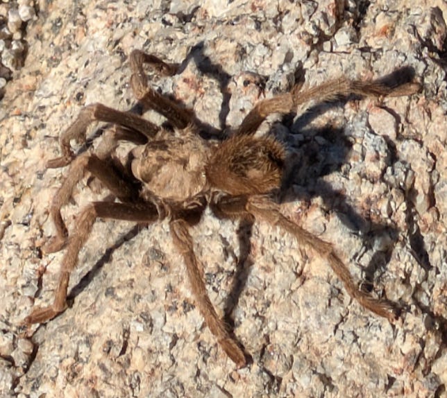 I was walking down the Split Rock trail in Joshua tree, admiring the rocks and plants and clear blue sky when I heard footsteps and tiny voices ahead of me. A moment later a stream of 5 kids appeared, running down the trail. I scooted to the side to let them pass. They were chattering, high energy bouncing down the trail. The leader was a young boy, face covered with dirt, body. He stopped short, feet from me and pointed at the ground, “TARANTULA!” He then moved on, walking for a moment then running again. The other kids stopped a moment too and moved on, “Like the one we caught yesterday”. Nearly already gone by the time I look down and see the lovely creature hanging out next to the trail on a rock less than a foot from the trail edge. I didn’t even notice… and I tend to notice things… and this young group noticed it at full speed, while chattering and running down a curvy trail. Kids are cool.