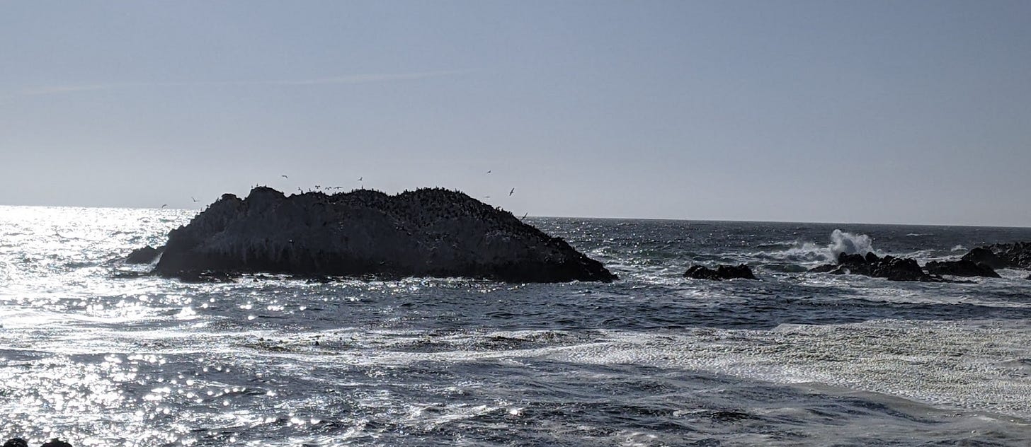 Mass yesterday meant I didn’t get to run with my group. Bummer. Today KS had a couple other things going on. Bummer. No run with her either. Gee whiz. How am I going to maintain my sanity? My running friends keep me grounded. I did run 10 Saturday evening anyway. Here’s Bird Rock in Pebble Beach.