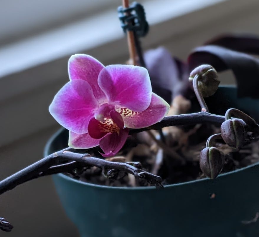 There are cycles in life, for sure. Last year about this time a friend gave me some plants in a gift planter. I separated out the plants. The spider plant is taking over my plant table. The orchid bloomed robustly for several months and then… well I’m not sure. I don’t know if I underwatered, overwatered or what but it wasn’t looking good. A couple of weeks ago I noticed a bud spike. Yesterday the first bloom came out. So cool.