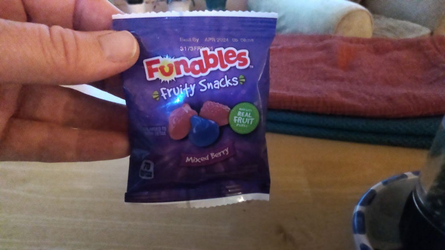 On the way home from a food drop yesterday I stopped at Groce Out (Grocery Outlet) to get some produce, bread, etc… I was very successful. Peppers, apples, salmon, good quality all purpose flour. Oh yes, doing well. And then I hit the snack aisle. Crap. A box of gummy fruity things…. CHEAP! I can’t resist.