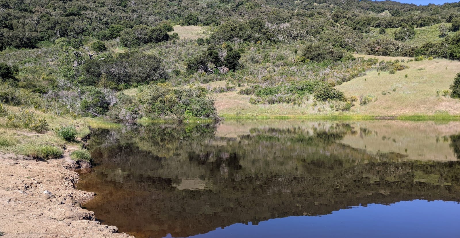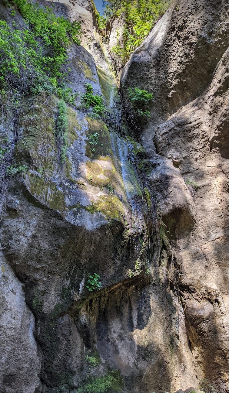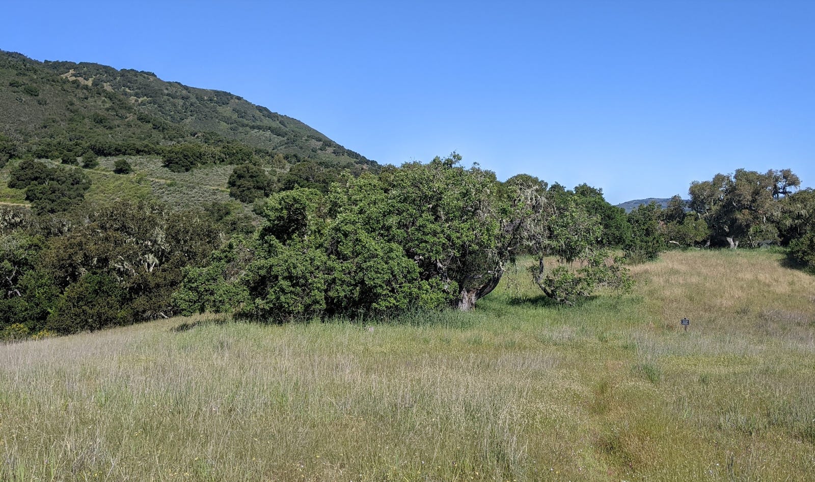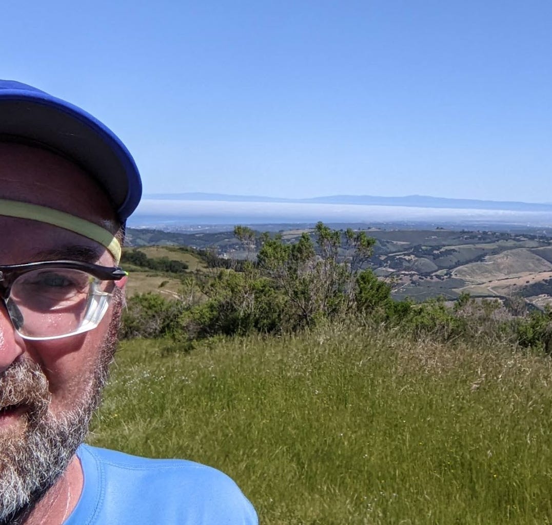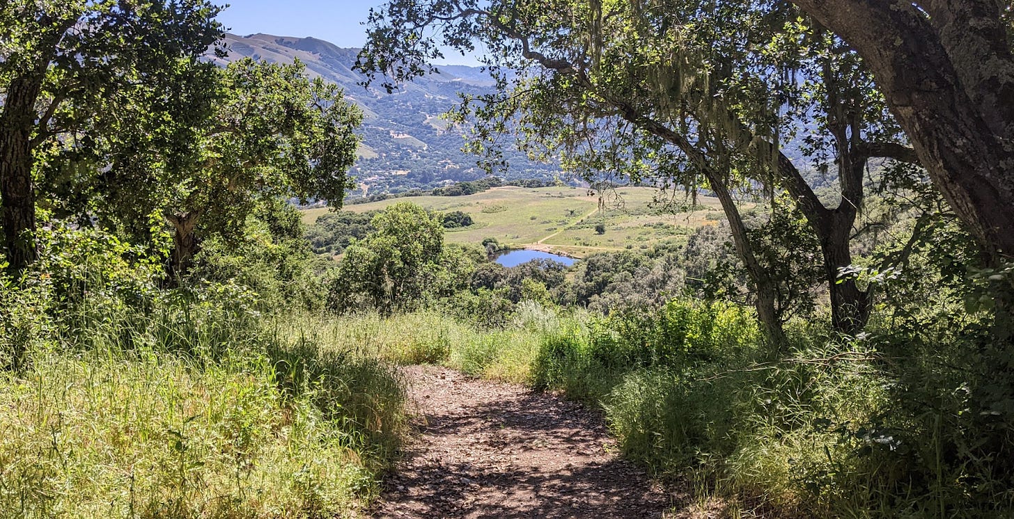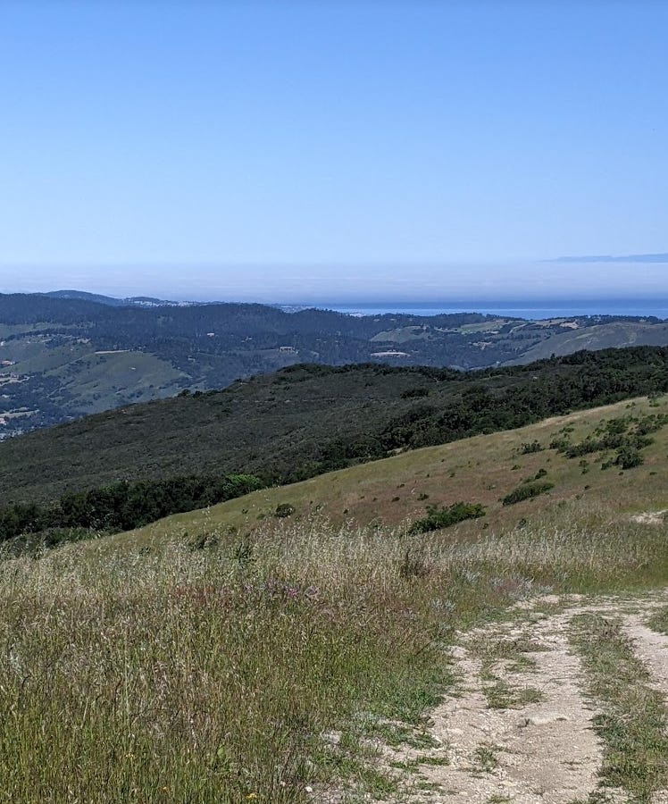 Last weekend all my running buddies had other things going on. Big trail race (too big for my back), Mother’s Day too. So, I took the opportunity to go to Garland Ranch and put in a nice trail run. I ran up waterfall trail and behold! There was water in the falls! Then I ran up to the Wedding tree. I had not been there in a while. It is looking quite healthy this year. I couldn’t even get to the base for a proper photo. Too many pokey plants. The pond at the mesa was full and mirrorlike. Then I ran up Snively’s ridge and down the other side. Flowers were blooming. Everything is green. The sky was clear and I could see for miles. There were more people than usual on the upper trails. Good to see people getting out. Here are some photos. 8 miles. 2000’ elevation. Got a coffee at The Beerded Bean afterwards. Tasty. The chocolate croissant? meh. Thought about Jeffrey’s next door. That’s where we had our wedding breakfast way back when. If we had a favorite place to eat… I guess it might just be Jeffrey’s.