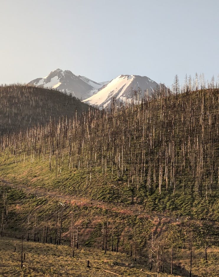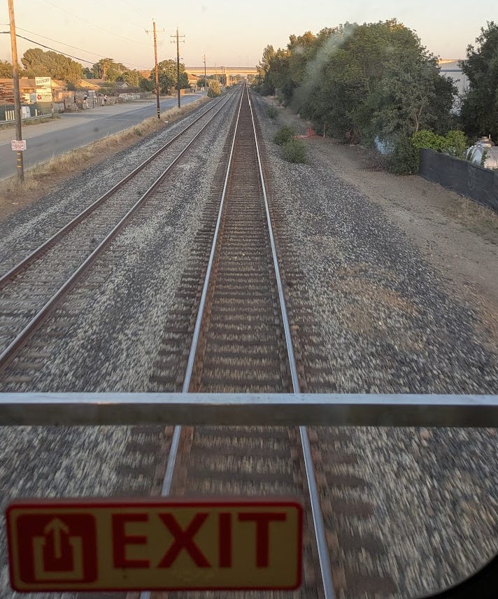 I woke to sunshine about 4:30. Mt. Shasta in view in the early dawn. The train did a big loop around it. This photo is maybe an hour after I first saw it. Lovely thing.