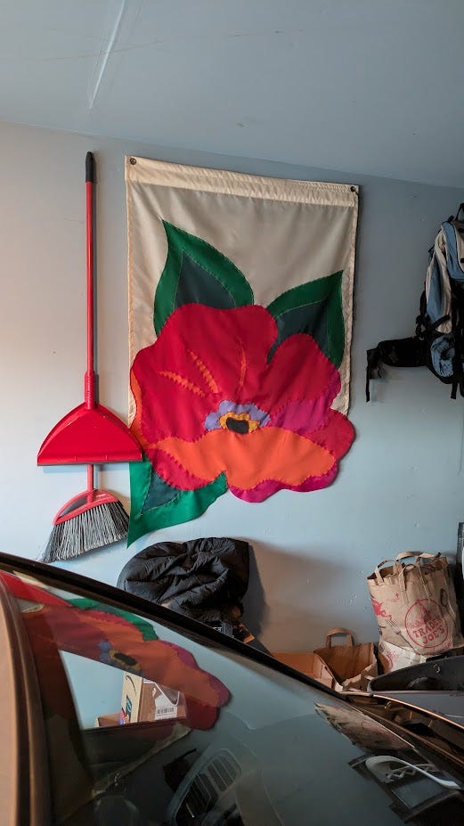 In the spring of 1998 I gave my 30 day notice at High Flying Banners up in Seattle. I’d worked there for three years. I started doing mostly bookkeeping and a little graphics. Then gradually, a whole lot of graphics. As a going away present my boss, Diana, asked me to design my own banner, pick my own fabrics and have the masterful sewing team put it together for me. Sewn applique, if you don’t know. At the time I thought it was quite a weird present. I mean - shouldn’t someone else pick the present? Yet… here it is. On the wall in the garage 26 years later. One of the few things I’ve consciously saved from my past. I see it every time I get in the car, get my bike, do laundry or do any other garage like thing. It holds a lot of fond memories and a lot of key learning elements from my past.