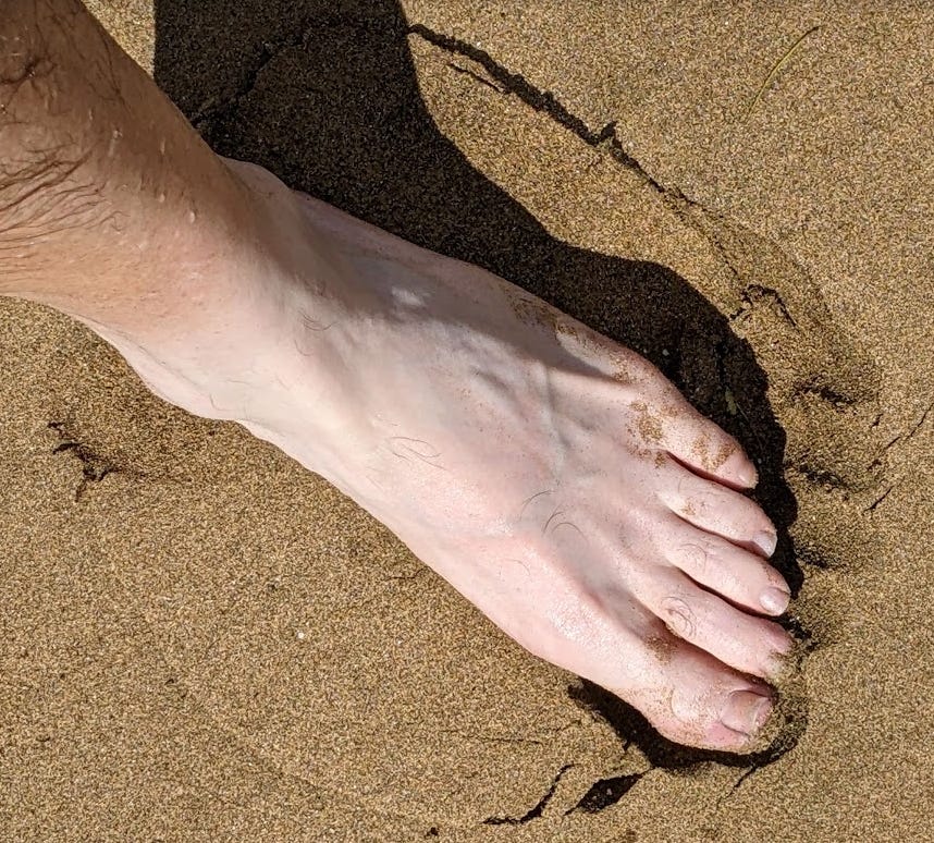 ONE: KS, the girls and I were walking on the beach on Maui last winter. Do be do be do. Then they appeared. Imprints in the sand. HUGE imprints in the sand. You can see in the photo that my first three toes fill up the spots for their first two toes. We followed the steps for a while. Never saw who they belonged to.