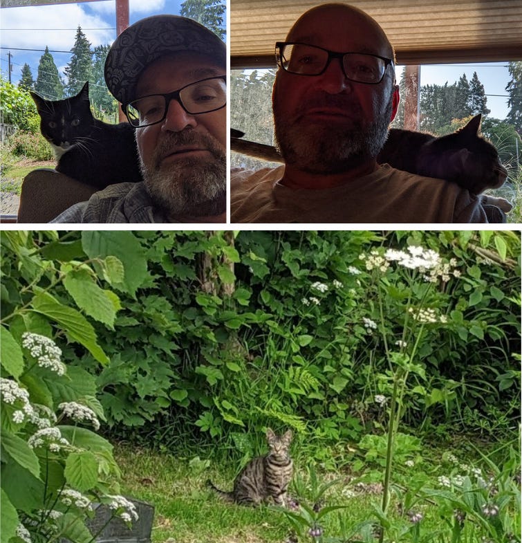 There have been cats, this summer. Cats in England, Cats in Olympia, Cats in Aptos. Katie liked cats. Cats generally like me. The two cats behind me went there of their own volition. Honestly! The one below? That’s as close as I got.