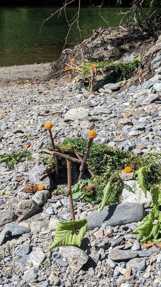 Spent time in Sitka with SK, GK and H… T was late getting there due to covid. Many years ago I was their best man… and I have to say, I was not a good best man. I was just coming out of my divorce and was not feeling particularly good about the institution of marriage at the time. I did the bare minimum of my duties. Thankfully they didn’t hold it against me. So fast forward to Sitka and I’m spending their anniversary with S while T is back home getting better. People in town thought we were a couple. Entertaining, but it sure pointed out to me the degree of my own aloneness. It would have been a fun trip with Katie. A different trip, for sure… but fun. The bears and raptors she would have loved… but I can also hear her afterwards, lamenting how the bears have lost their parents and are separate from their bear lives in a way they have no control over (tying it to her own childhood). Many things remind me of the suffering she went through… and then, out of nowhere, something cheery. A fairy settlement along the creek near the Raptors. Katie, and my mom, - both - would have loved it.