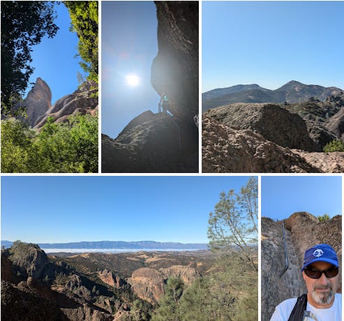 Two days ago KS and I ran/hiked Pinnacles. Fabulous day. Gorgeous. Not too hot to start but then, yeah, I got toasty. Then, near the end, when I wasn’t thinking too clearly we entered the caves. Took a silly wrong turn and ended up in a precarious location or two. Thankfully common sense prevailed and we backtracked to the right place.