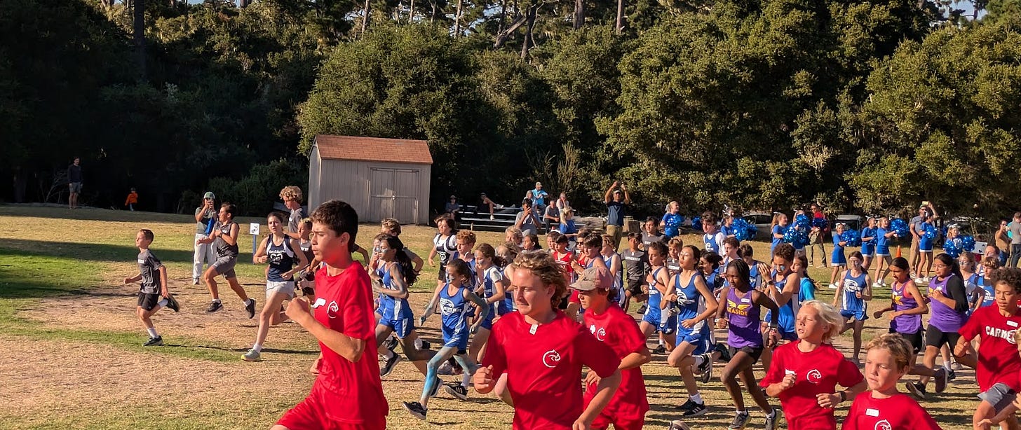 JV starts. We’ve got five girls in the race. It’s looking good. They’re smiling and laughing as they get ready to go. And they’re off!!! A whirl of dust and pounding legs. Near the end of the first lap I wait to cheer them on. First one through is S. She’s in the top 20. I cheer her on, “Go S! you’re doing great”. She sees me and breaks down. Hands on knees. Tears. “I can’t!”. Well - that took me off guard… a bunch of runners pass her. I try to talk her down. “you’re doing great, just slow down a little, catch your breath, you can do this, you’ll find your legs, you’re a great runner” and she staggers off like she’s in a zombie apocalypse.