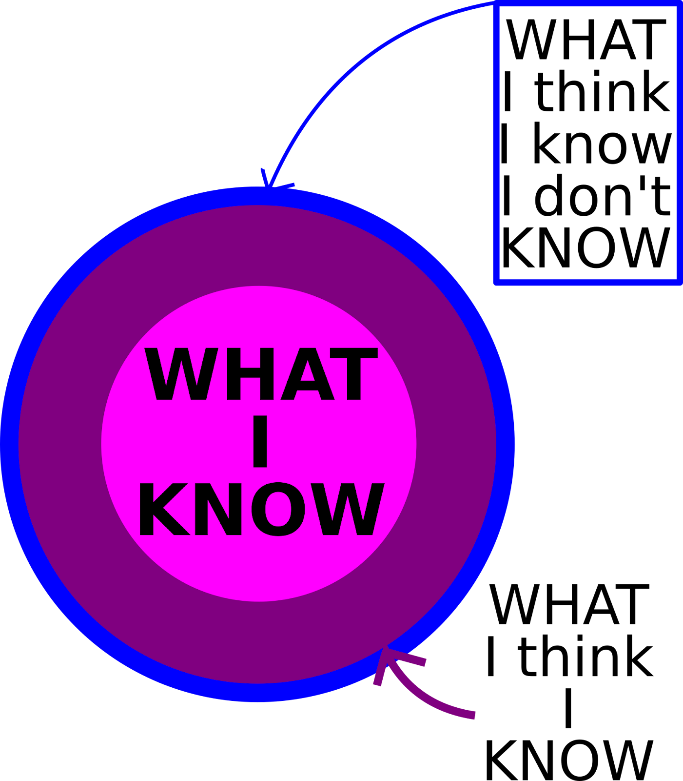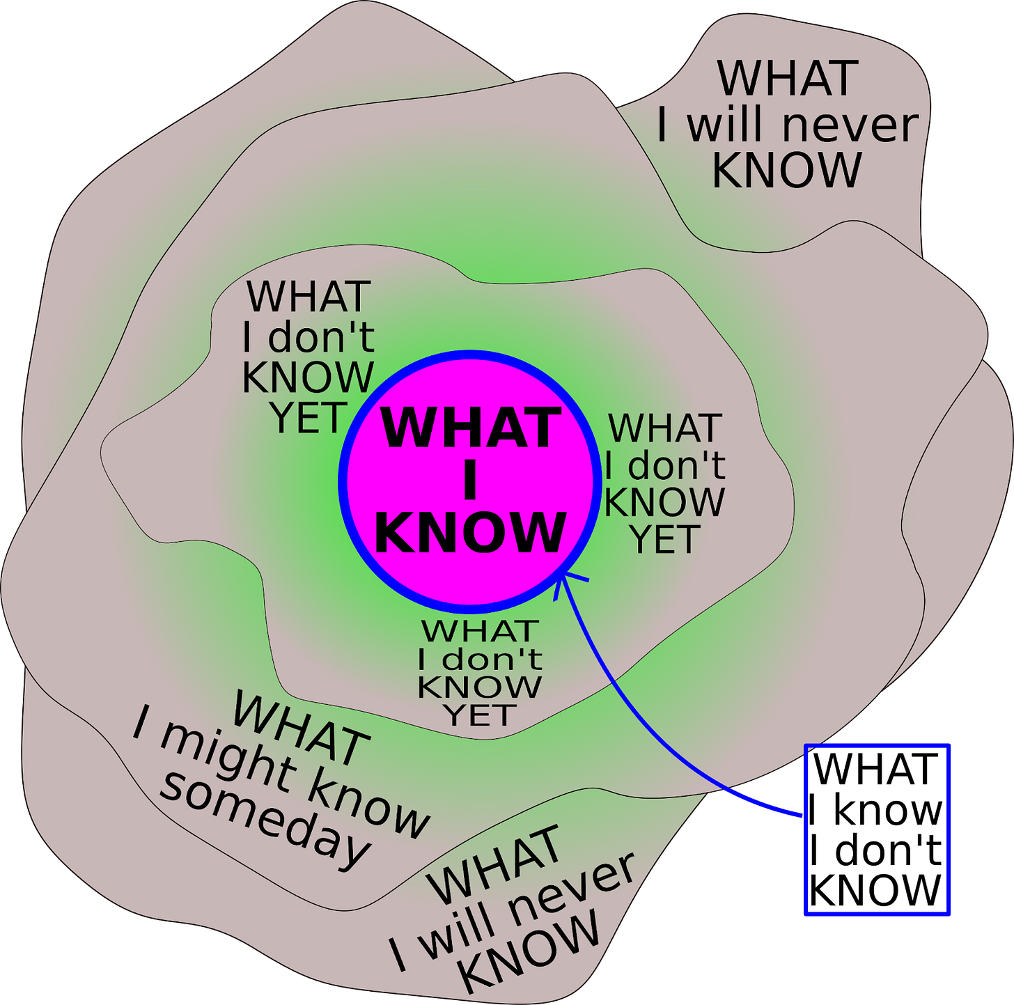 I made a fancier graphic and added to it. There’s what I know in the middle. Then there’s an area of things I will know eventually. There’s an area of things I might know some day. I might even be aware they exist but never know it. And then there’s a whole boat load of stuff I will never know. I won’t ever even be aware that I don’t know it.