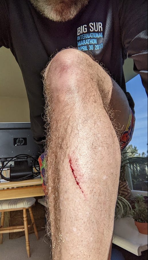 I remember my mom saying, “I knew he had a good time if he came home bloody”. Yup, I had a lot of skinned elbows and knees. Here’s a new one from Saturday. Yes mom, I had a good time.
