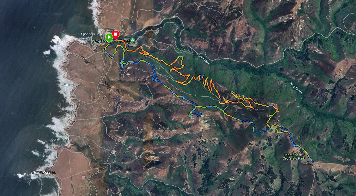 The map. I went up Valencia Peak and then up Oat Peak. The blue lines show where it was steepest. The red and orange were downhill on the way back. 10 miles and about 2000’
